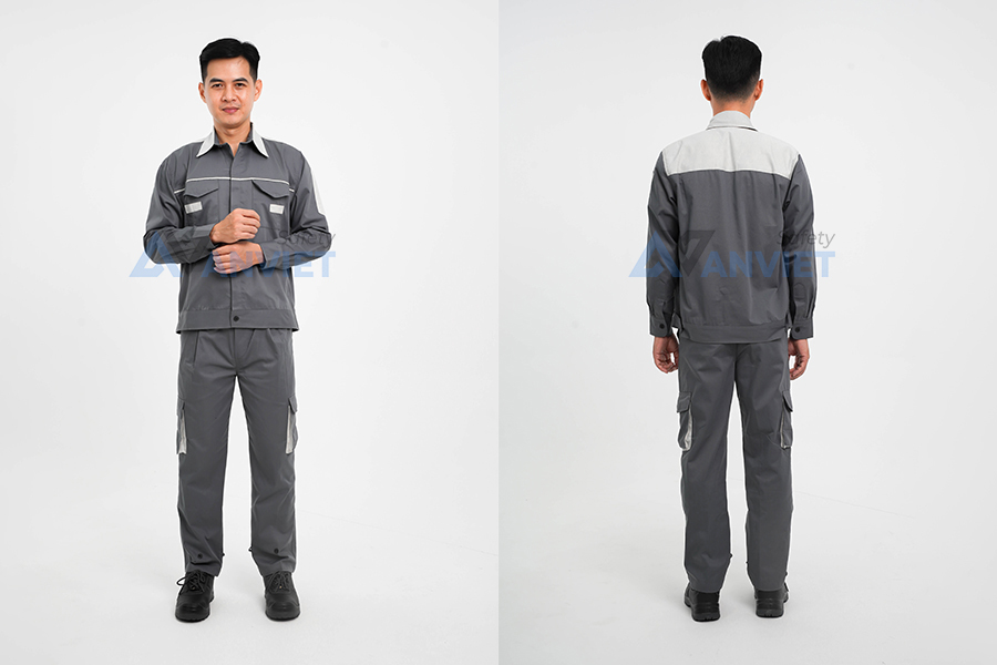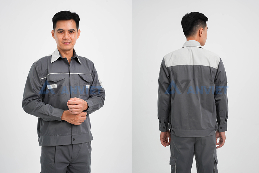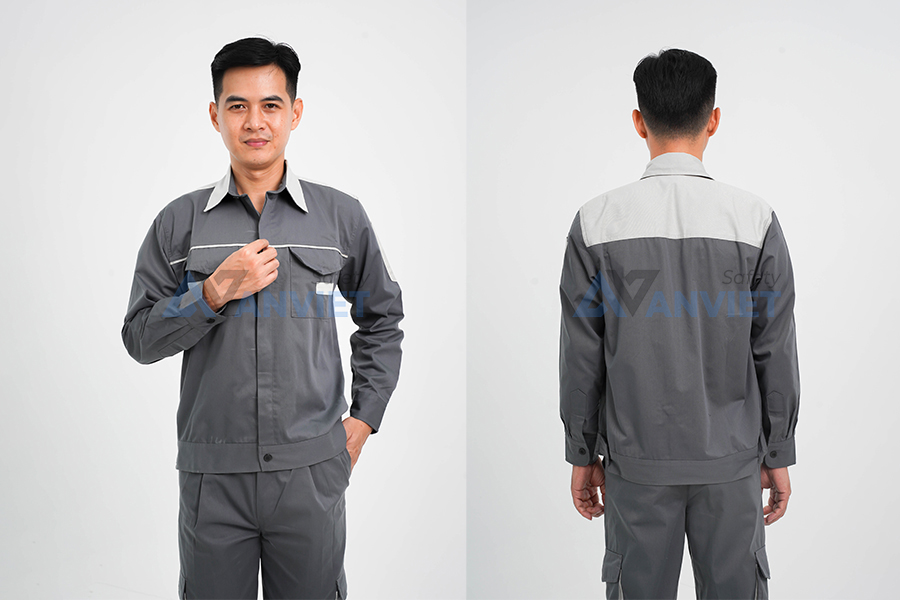 Form áo tay dài, cổ bẻ truyền thống mang đến sự chỉnh chu, nghiêm túc, phù hợp cho cả công nhân lẫn kỹ sư, giám sát công trình. Phần cổ và đường viền phối màu ghi sáng làm điểm nhấn, vừa tạo sự nhận diện dễ dàng, vừa tăng tính thẩm mỹ.