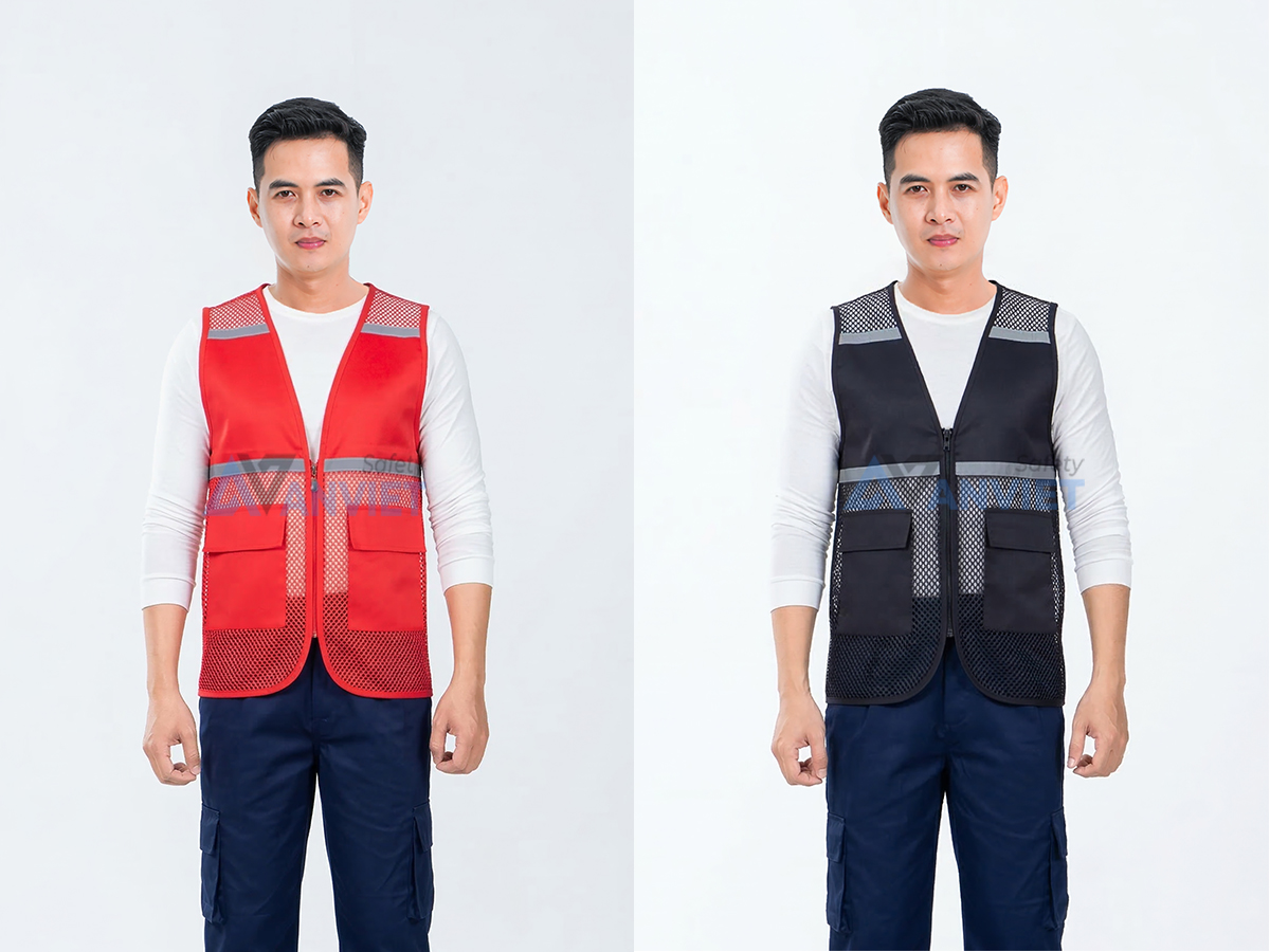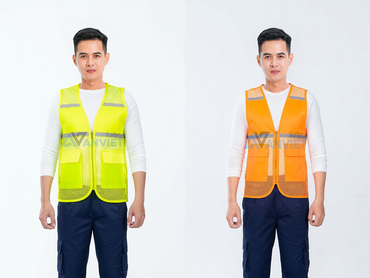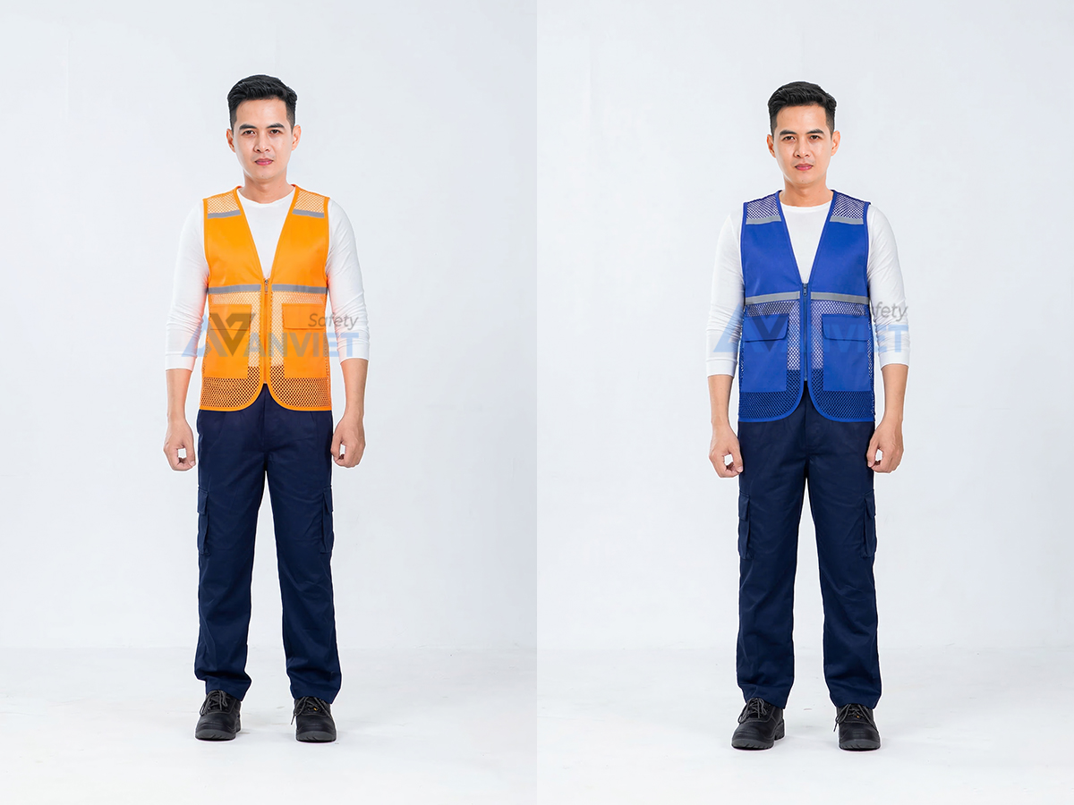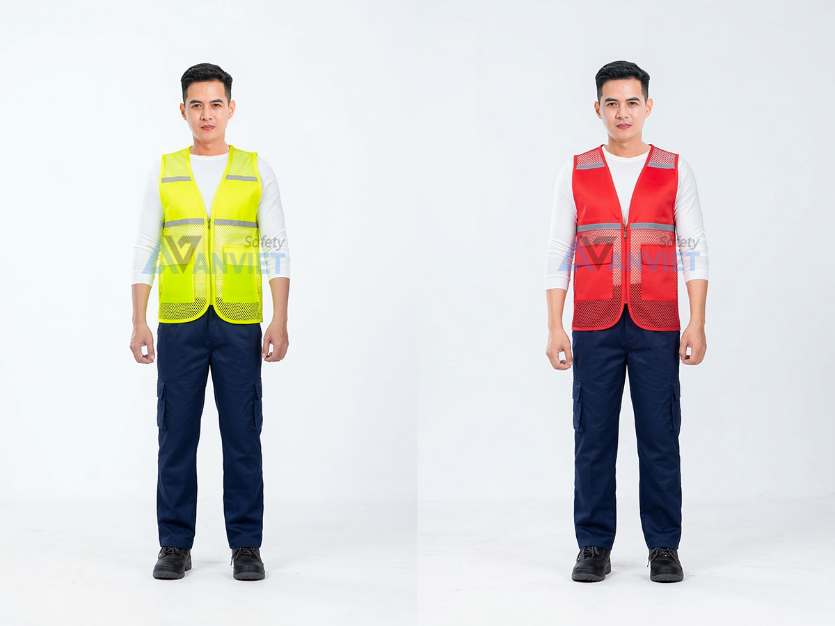 Sản phẩm có nhiều màu sắc như xanh dương, đỏ, cam, vàng neon và đen, phù hợp với nhiều nhu cầu và môi trường làm việc khác nhau. Áo có khóa kéo phía trước và túi tiện dụng, thích hợp cho cả nam và nữ.