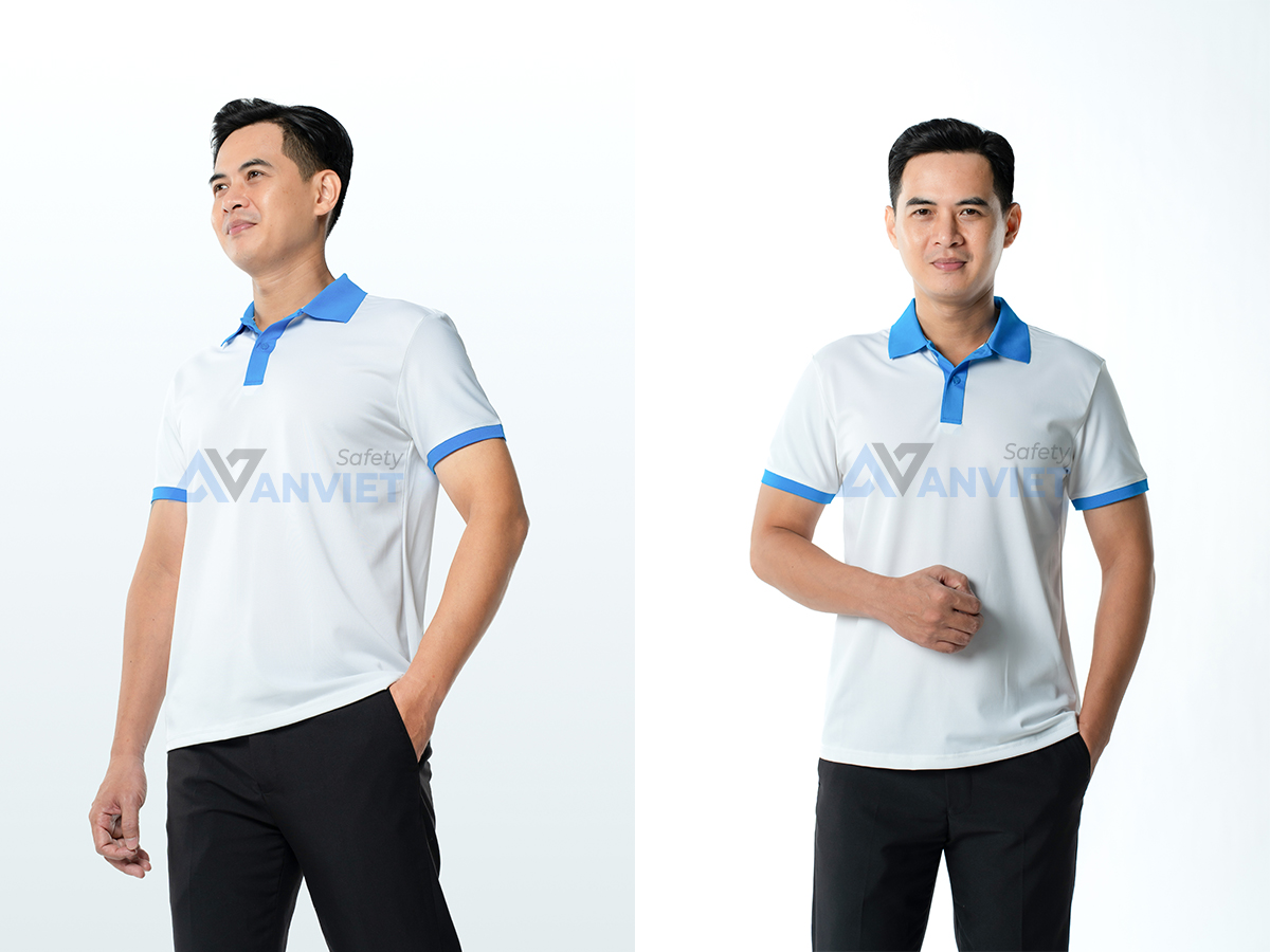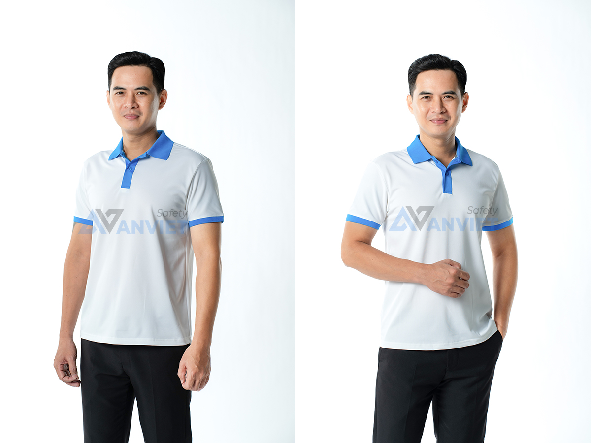 Áo polo nổi bật với gam trắng chủ đạo kết hợp cổ và tay áo xanh dương, tạo điểm nhấn hiện đại, năng động nhưng không kém phần sang trọng.