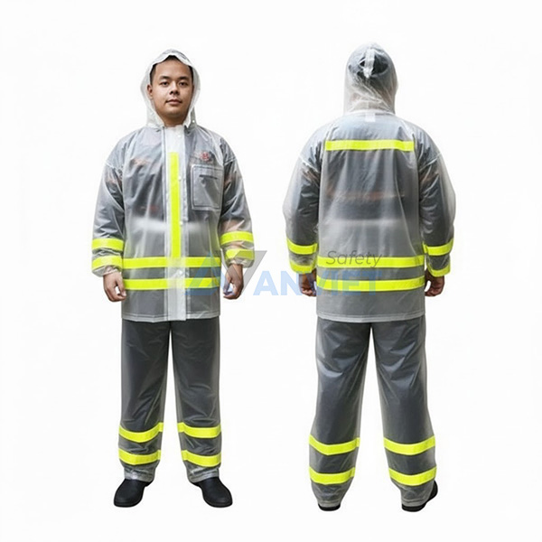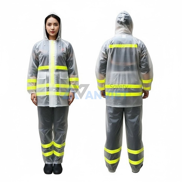 Bộ áo mưa trong suốt phản quang được sản xuất từ chất liệu PVC trong mờ cao cấp, kết hợp các dải phản quang nổi bật, giúp tăng khả năng nhận diện trong điều kiện ánh sáng yếu, hỗ trợ an toàn khi di chuyển và làm việc vào ban đêm.