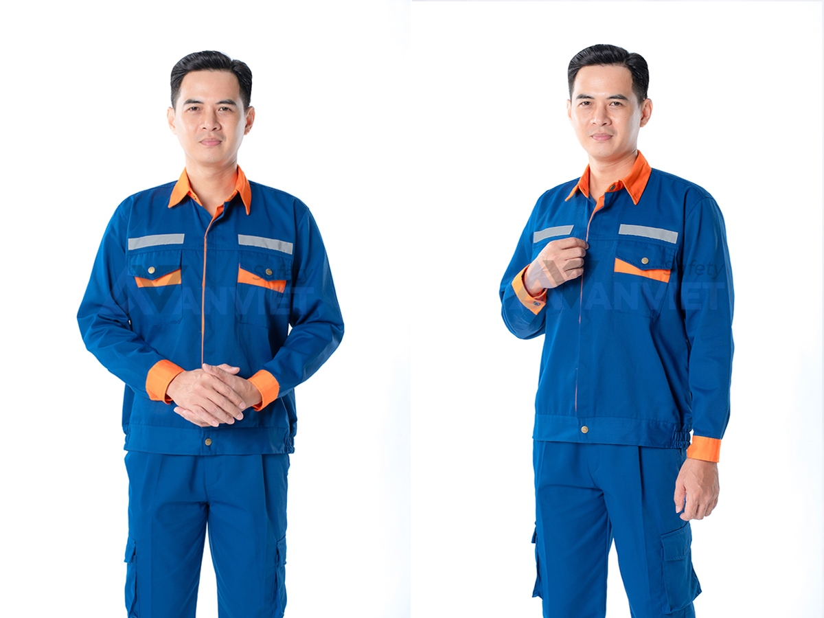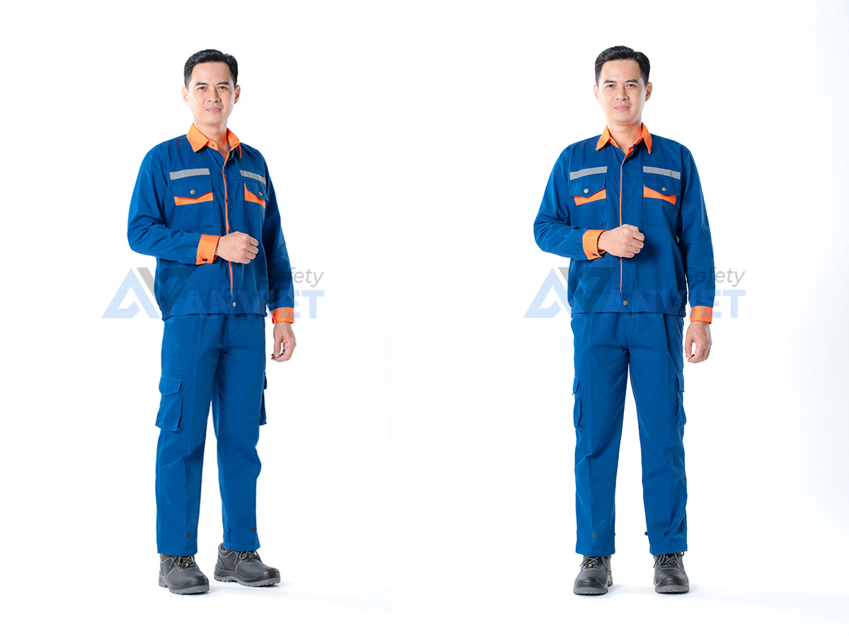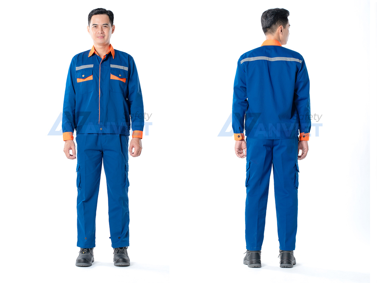 Bộ đồng phục gây ấn tượng với phối màu xanh dương chủ đạo kết hợp cam nổi bật, mang lại cảm giác trẻ trung, dễ nhận diện trong môi trường công nghiệp.