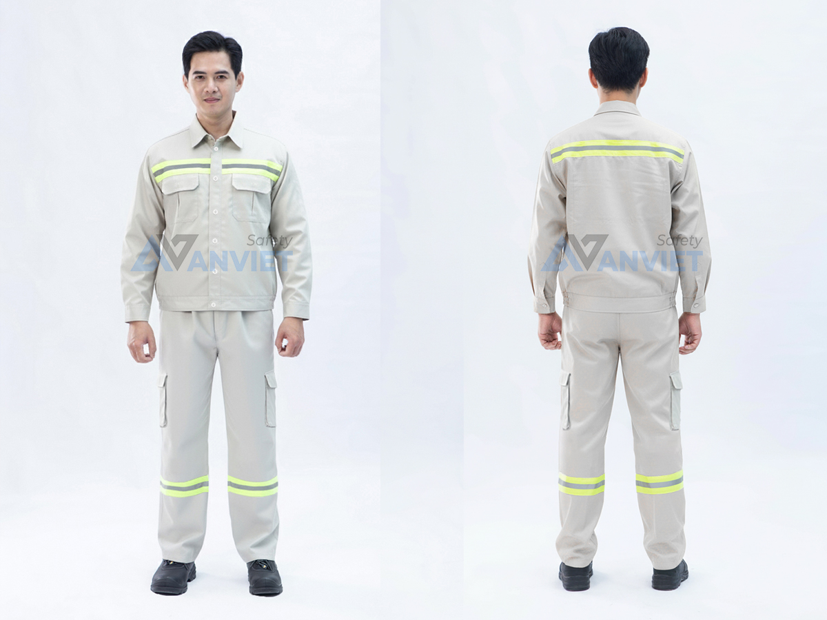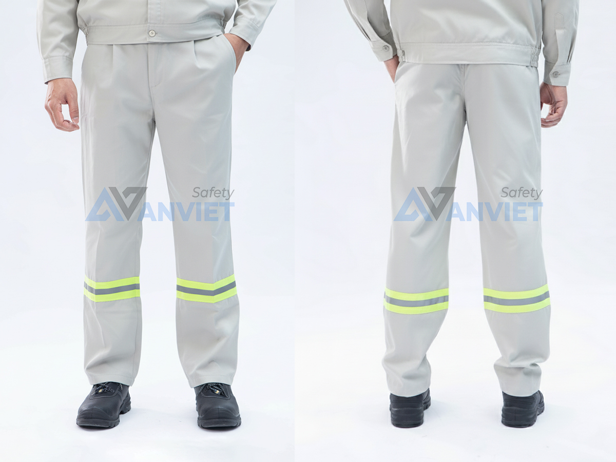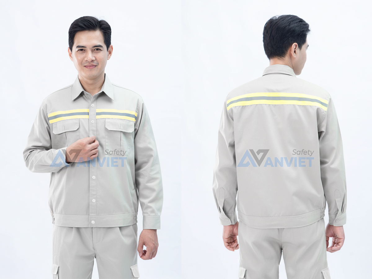 - Dây phản quang nổi bật được bố trí trên ngực áo và gấu quần. Chi tiết phản quang màu vàng chanhphối xám bạc này giúp tăng cường khả năng nhận diện người lao động trong điều kiện thiếu sáng hoặc ban đêm, đảm bảo an toàn.