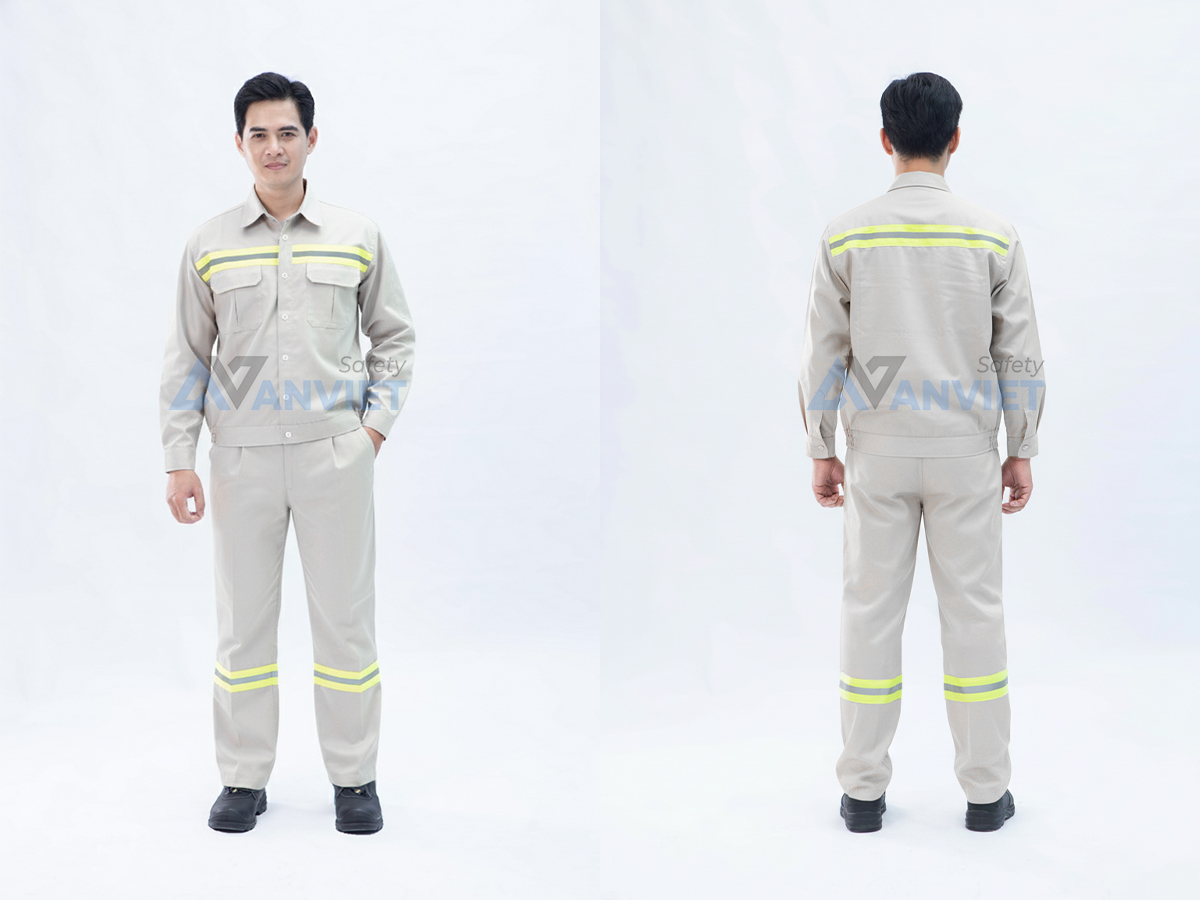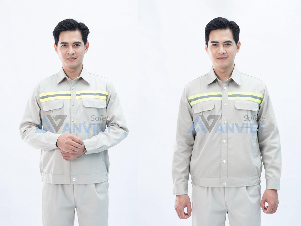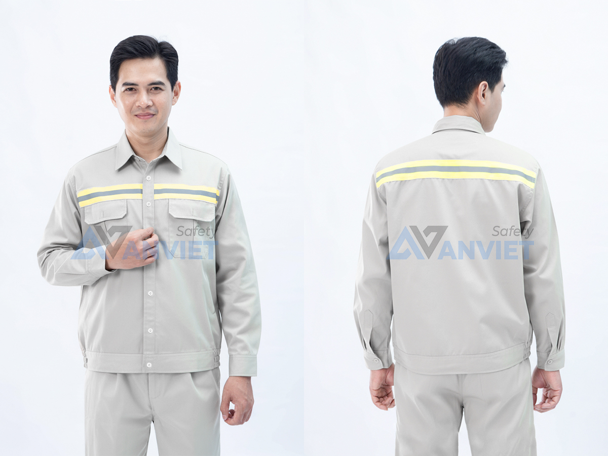 - Dây phản quang nổi bật được bố trí trên ngực áo và gấu quần. Chi tiết phản quang màu vàng chanhphối xám bạc này giúp tăng cường khả năng nhận diện người lao động trong điều kiện thiếu sáng hoặc ban đêm, đảm bảo an toàn.