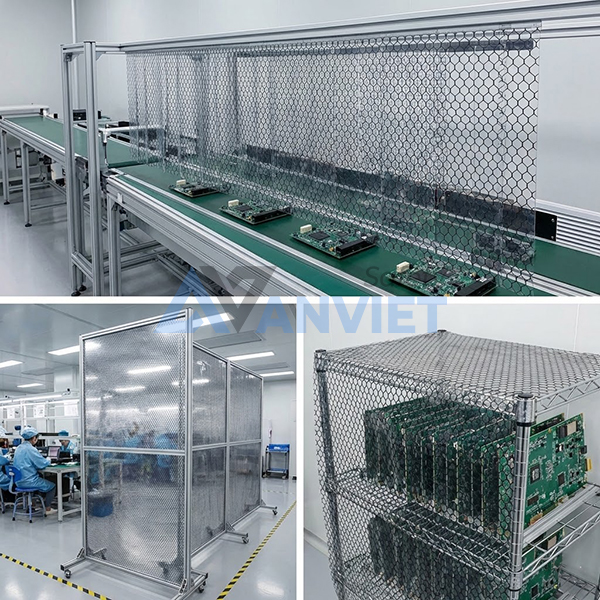 - Ngành điện tử – bán dẫn: Làm rèm phòng sạch, vách ngăn khu SMT, che chắn dây chuyền sản xuất, bảo vệ linh kiện nhạy cảm khỏi tĩnh điện.