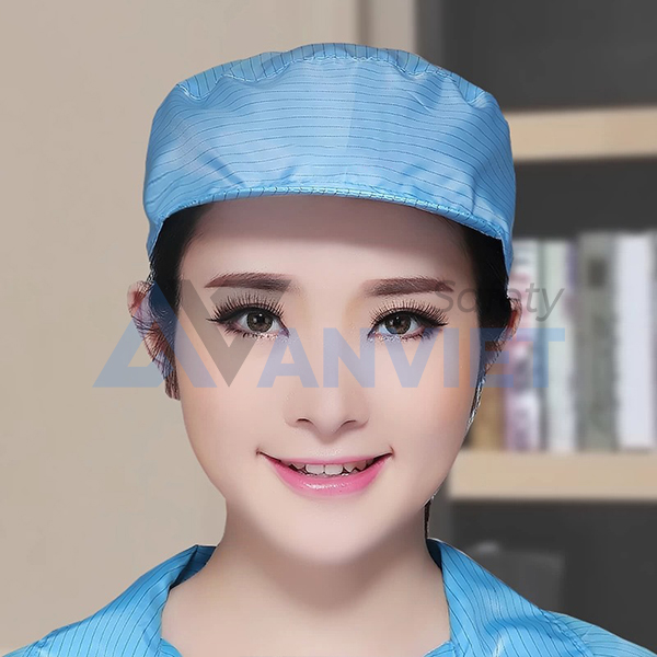 Mũ được may từ vải polyester pha sợi carbon dẫn điện, có khả năng phân tán và kiểm soát điện tích tĩnh hiệu quả. Bề mặt vải được dệt dạng kẻ sọc hoặc caro, đảm bảo tính ổn định điện trở và đáp ứng yêu cầu sử dụng trong môi trường phòng sạch công nghiệp.