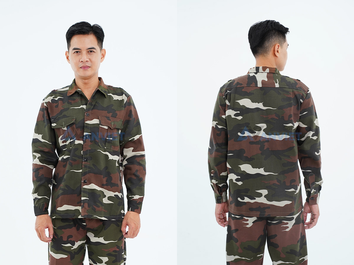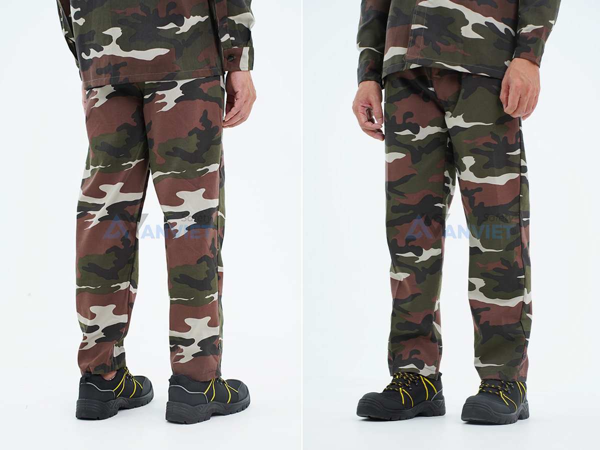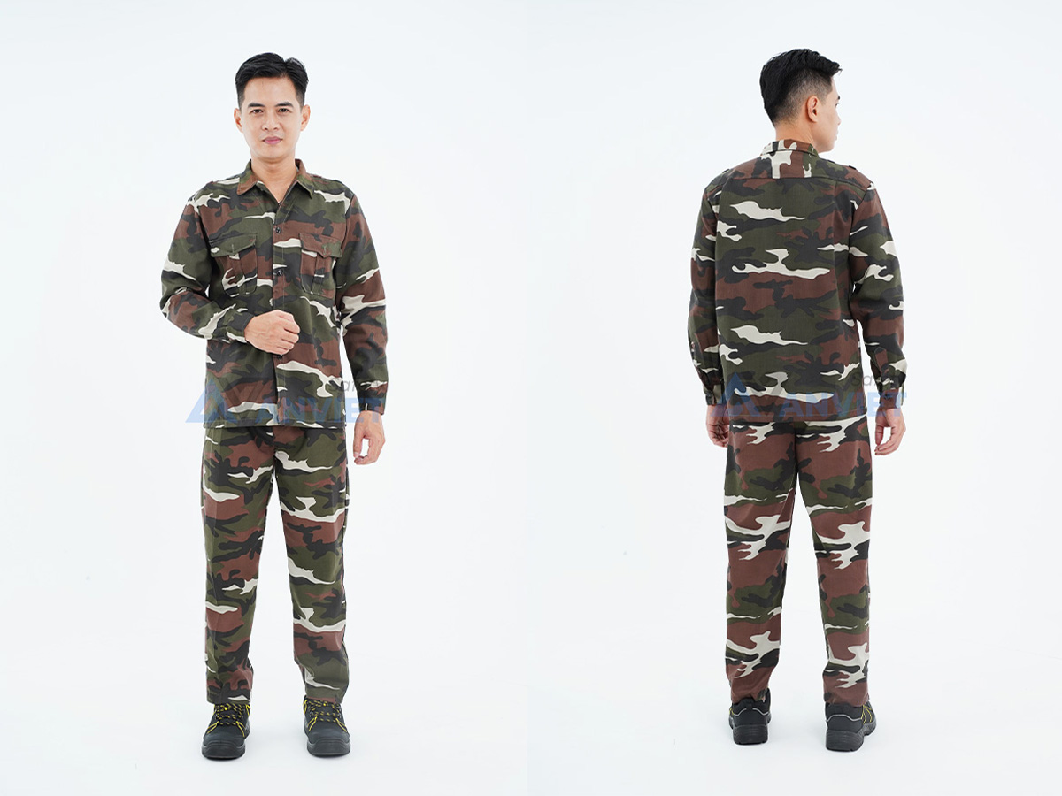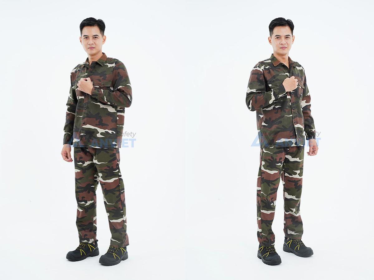 Họa tiết rằn ri xanh nâu mạnh mẽ, phù hợp môi trường làm việc nhiều bụi bẩn, dầu mỡ. Màu sắc thực tế, dễ sử dụng, mang lại vẻ ngoài khỏe khoắn và chuyên nghiệp