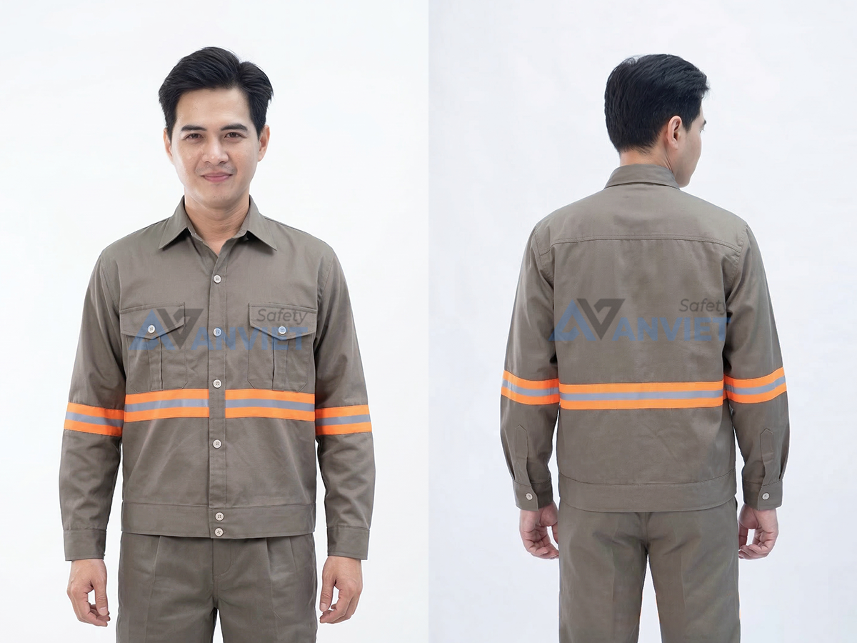 Điểm nổi bật của áo là dải phản quang màu cam được bố trí ngang thân áo và phần tay áo giúp tăng khả năng nhận diện trong điều kiện ánh sáng yếu, hỗ trợ đảm bảo an toàn khi làm việc tại công trường, khu vực giao thông hoặc môi trường làm việc ban đêm.