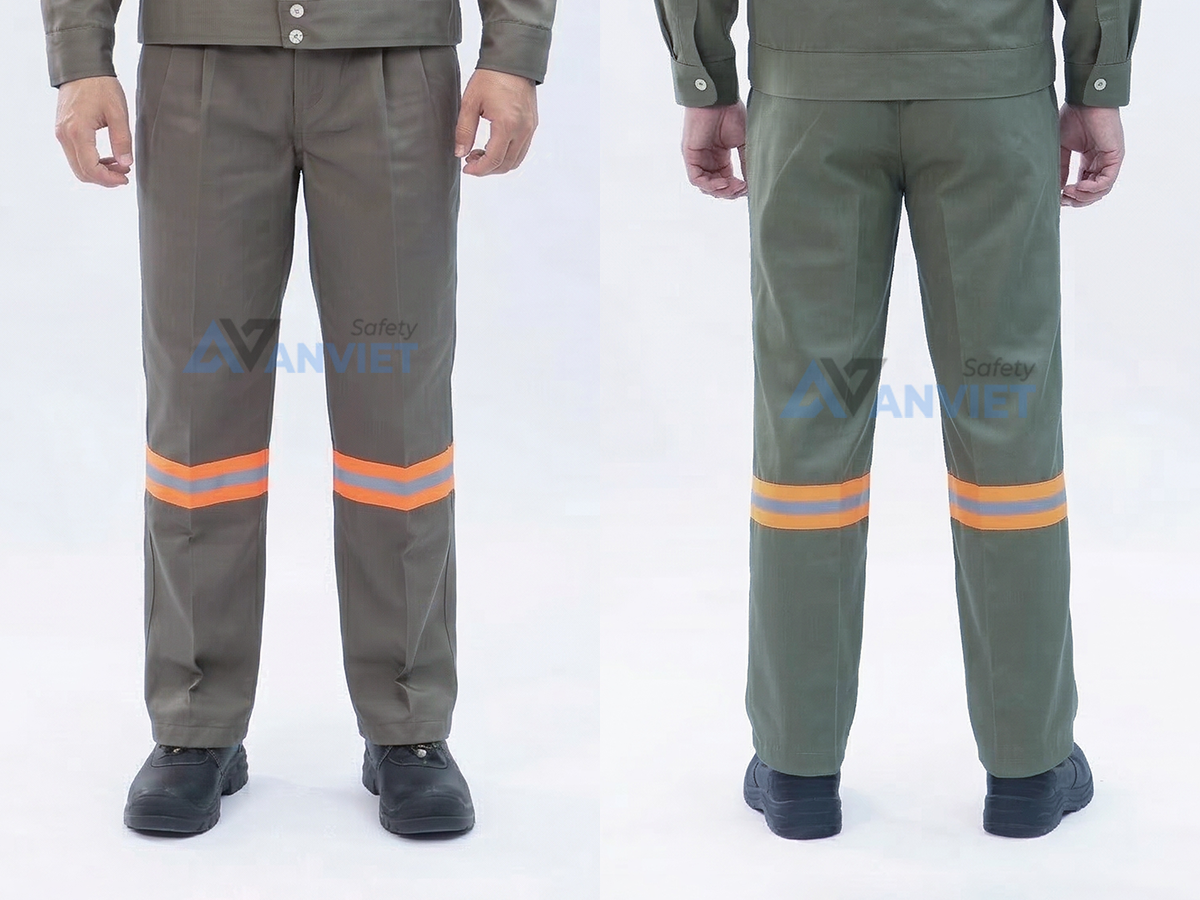 Phần ống quần được may thêm dải phản quang màu cam nổi bật tăng khả năng nhận diện trong môi trường thiếu ánh sáng. Chất liệu kaki dày dặn giúp quần chịu được các hoạt động lao động nặng, hạn chế rách hoặc mài mòn trong quá trình sử dụng.